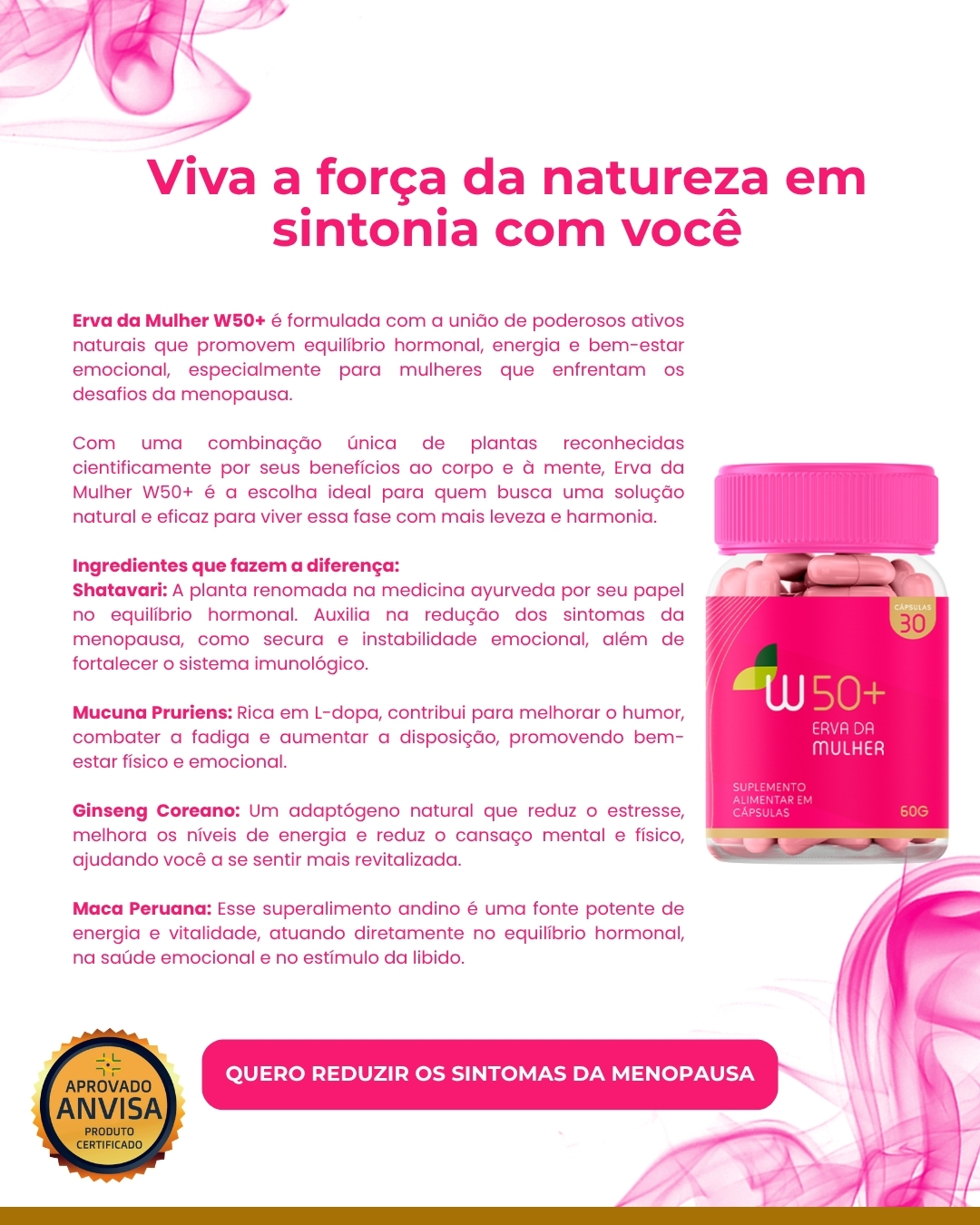 Erva da Mulher acredita que o equilíbrio vem de escolhas cuidadosas e naturais. Por isso, sua fórmula reúne poderosos ingredientes como Shatavari, Mucuna Pruriens, Maca Peruana e Ginseng Coreano, conhecidos por regular os hormônios, reduzir a ansiedade, melhorar o humor, aumentar a energia e devolver a vitalidade que você merece.